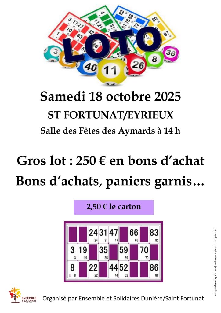 LOTO organisé par Ensemble et Solidaires samedi 18 octobre 2025 à 14h à la salle des fêtes de St Fortunat-sur-Eyrieux